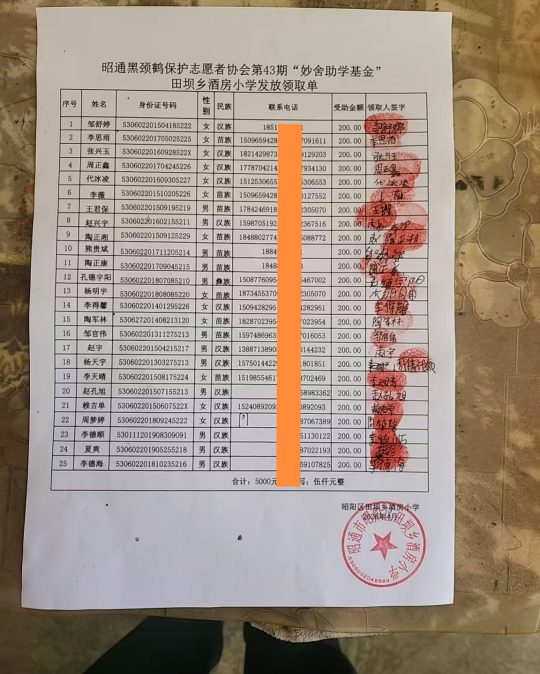 本网讯 2026年4月23日,昭通黑颈鹤保护志愿者协会监督员邹廷鸥,携协会会员赵庆文、邹廷瑶驱车一百余公里,前往昭阳区田坝乡酒房小学,顺利将上海“妙舍”助学基金募集的5000元爱心善款,发放至25名贫困学生手中,为山区学子送去暖心关怀。